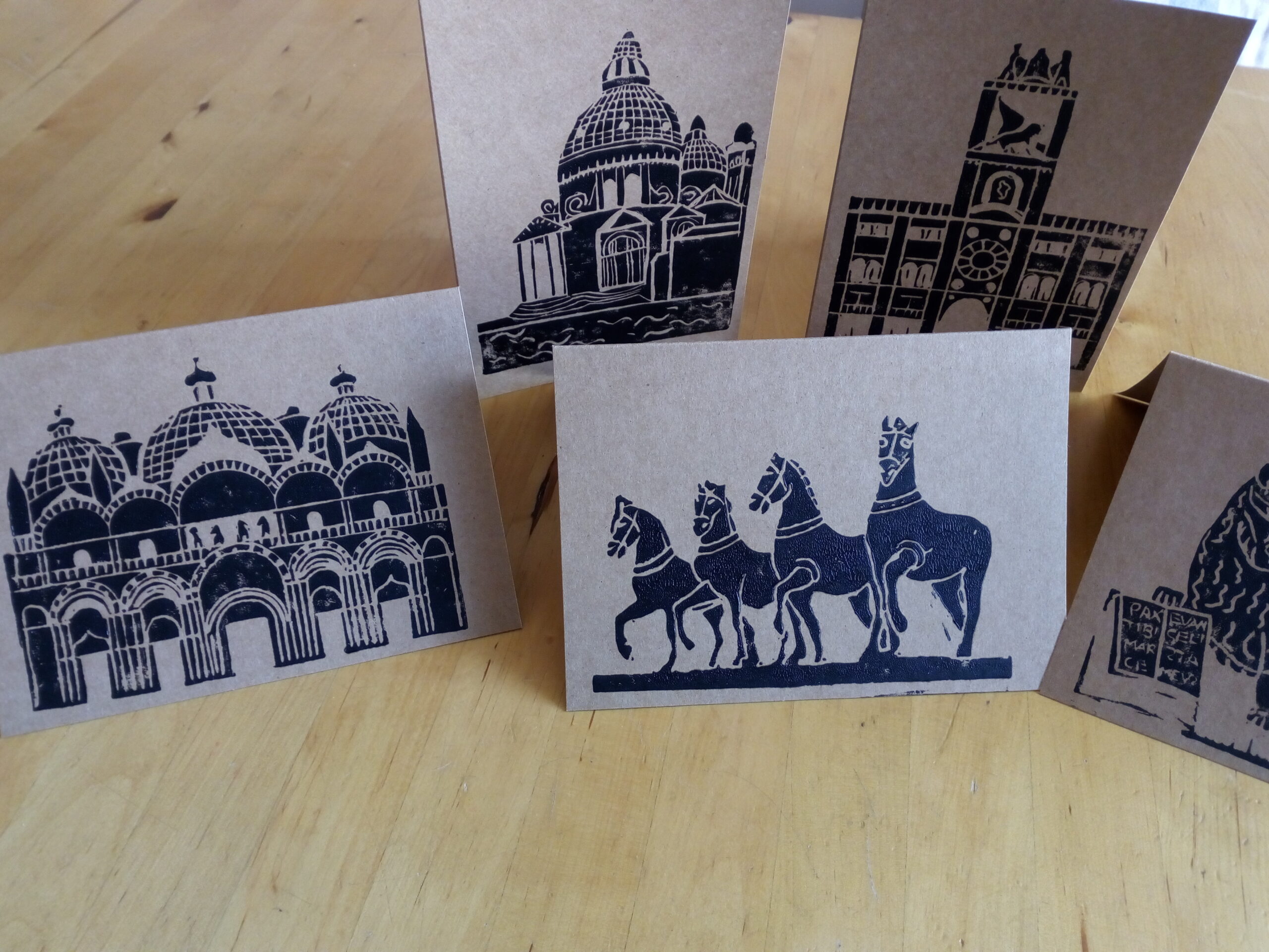 Set of five hand printed lino cut images of Venetian icons on recycled kraft paper cardstock with matching envelopes.
